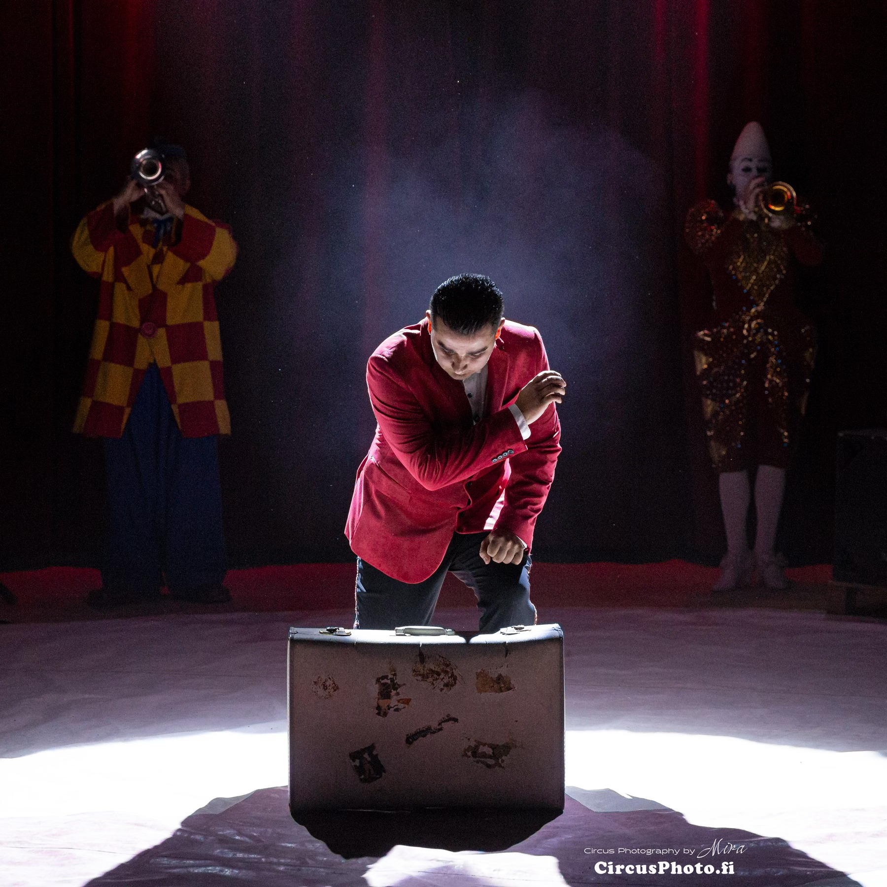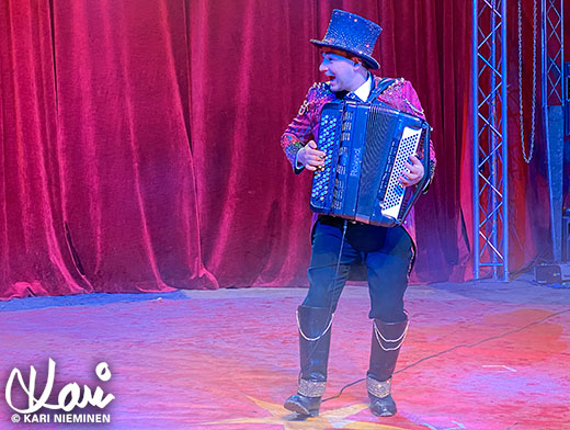 Samir Lindfors is the Director and Founder of Circus Golden Star, where he performs as a ringmaster, musician, and magician. Originally from Finland, his passion for circus began at age two after discovering his grandfather’s circus suitcase.
